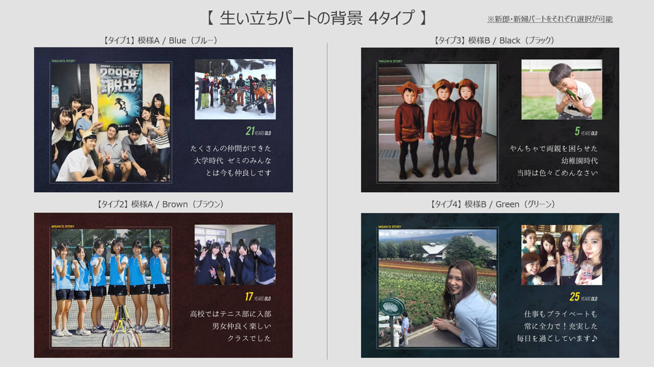 もう一つの特徴は、生い立ちパートの背景を新郎パート・新婦パートそれぞれ4つのタイプから選ぶことができます。背景タイプは両方のサンプルムービーをご確認ください。